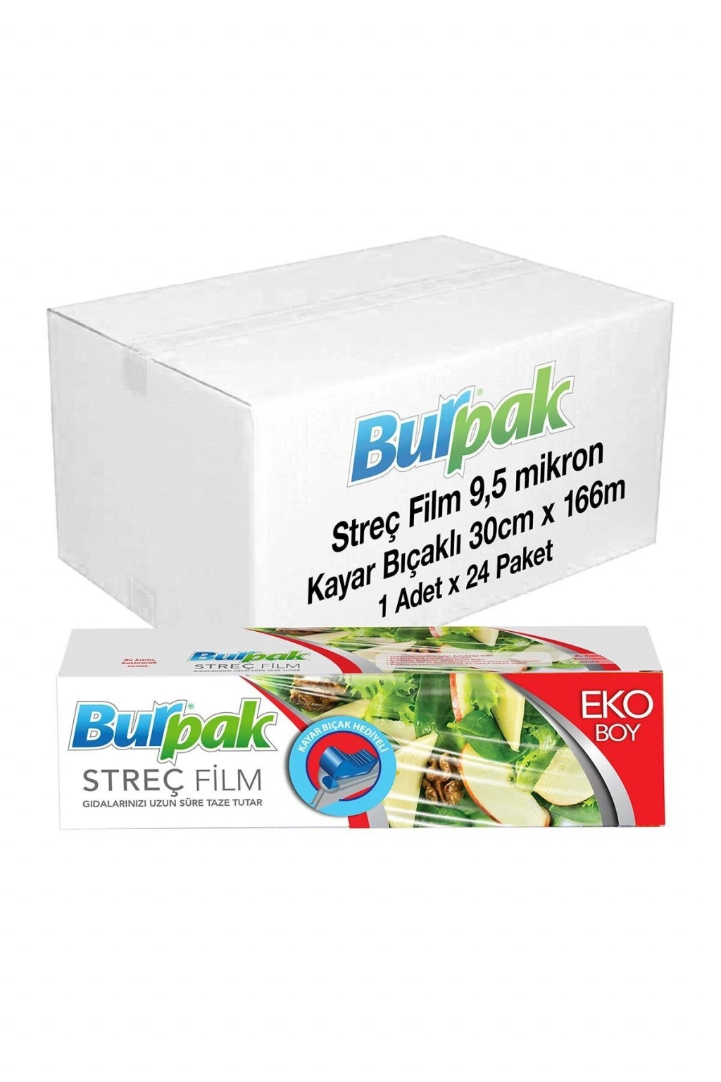 Burpak Kayar Bıçak Hediyeli Streç Film 30cm x 166m 10mic x 24 Paket (Koli) 30 cm genişliğinde, 166 m uzunluğunda, 10 micron kalınlığında streç film.; Kayar bıçak hediyesi ile pratik kullanım sağlar, istenilen boyutta kolayca kesilebilir.; Gıda ile temasa uygun, hijyeniktir ve mikrop tutmaz.; Esnek yapısı ile yüksek yapışma gücü sunar.; Şeffaf yapısı, sarılan ürünün görünürlüğünü artırır ve şık bir sunum sağlar.; Koli içerisinde 24 paket bulunur, ekonomik alım imkanı sağlar.