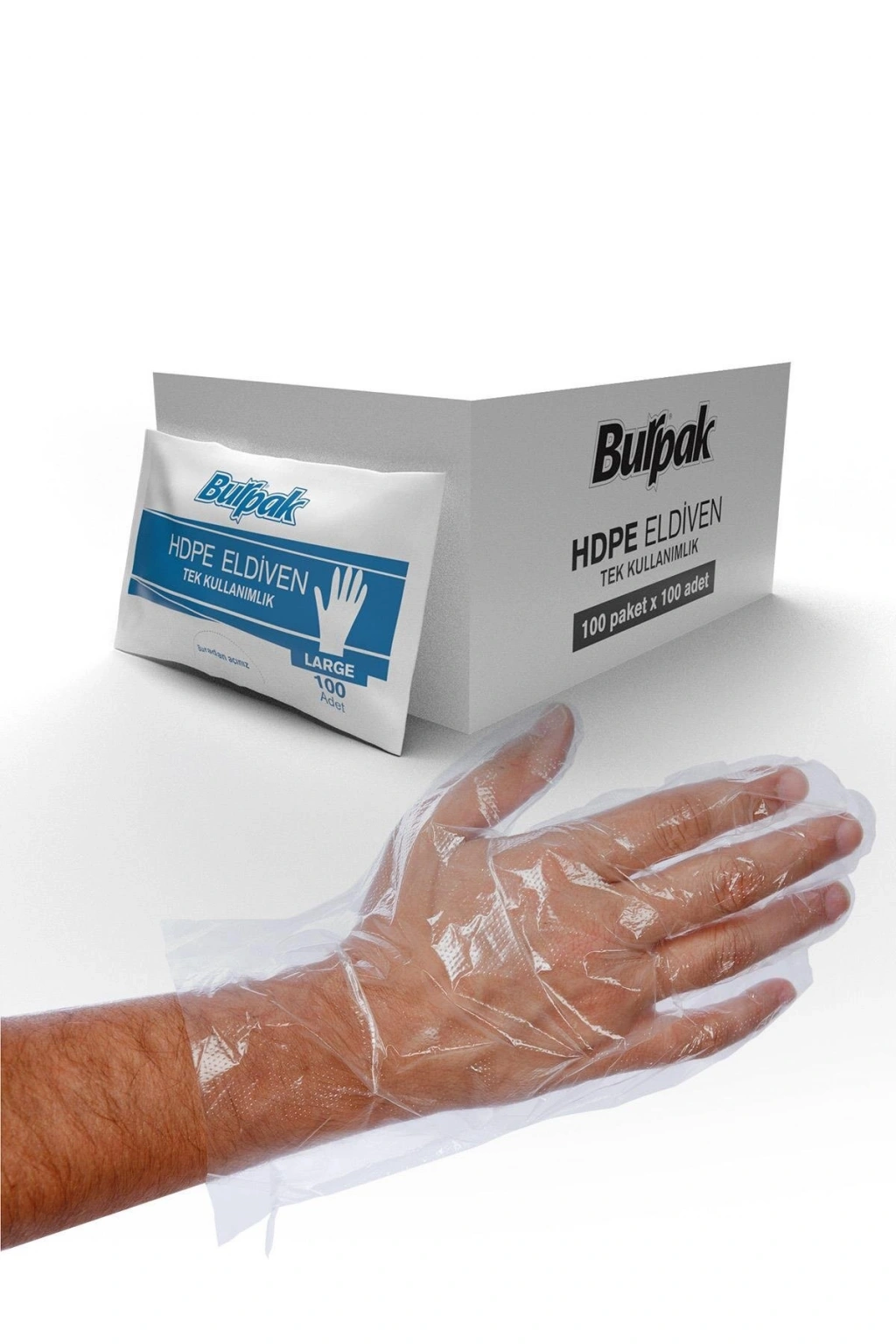 Pratik ve Hijyenik Kullanım Burpak Şeffaf Eldiven, pratik kullanımı sayesinde gıdaların hijyenik şekilde hazırlanmasına olanak tanır.; Gıda, sağlık, temizlik ve hijyen gerektiren birçok alanda güvenle kullanılabilir.; ve kullanışlı yapısı sayesinde hızlı ve kolay bir çözüm sunar.; Konforlu ve Esnek Tasarım Tek beden olarak üretilen bu eldiven, her boy el için uygundur.; Hafif ve esnek yapısı sayesinde elin hareket kabiliyetini kısıtlamaz ve her iki elde de rahatlıkla kullanılabilir.; Ürün Özellikleri: Malzeme: HDPE (Yüksek Yoğunluklu Polietilen) Beden: L (Tek beden olarak geniş ellere uygundur) Renk: Şeffaf Steril / Non-Steril: Non-steril Paket İçi Adet: 100 Pudralı / Pudrasız: Pudrasız Öncelikli Kullanım Alanları: Gıda hazırlama ve servis Sağlık ve bakım hizmetleri Temizlik ve hijyen uygulamaları Hızlı ve pratik el koruması gerektiren işler