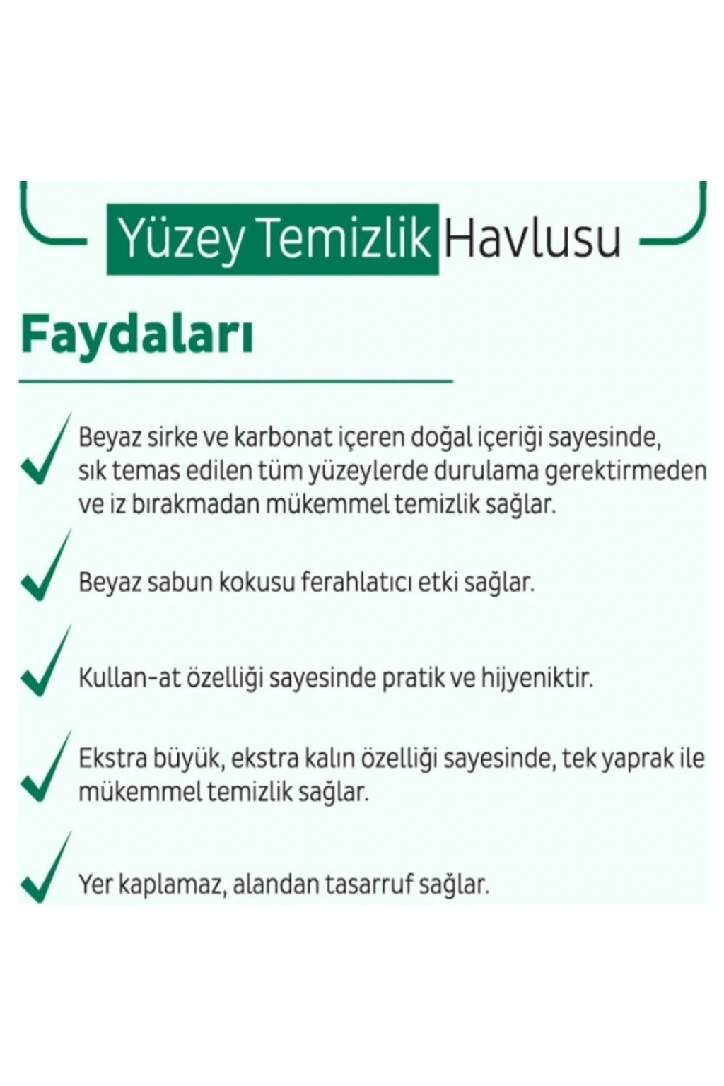 2*100 toplam 200 yaprak Iz bırakmayan doğal içerikli formül Mükemmel temizliğin doğal formülü beyaz sirke karbonat beyaz sabun kokusu Ekstra büyük; Ekstra kalın cam yüzeylerde masa , tezgah yüzeylerinde wc , lavabo , Banyo temizliğinde halı , elektronik eşya temizliğinde durulama gerektirmeyen pratik , Hijyenik , kullan; At yüzey temizlik havlusu 100;