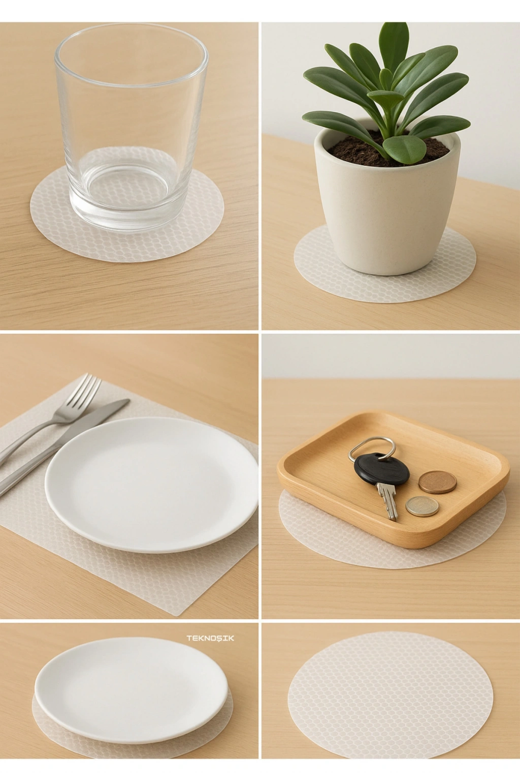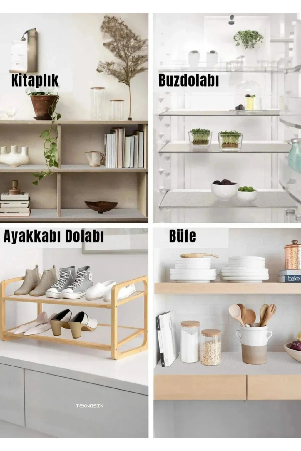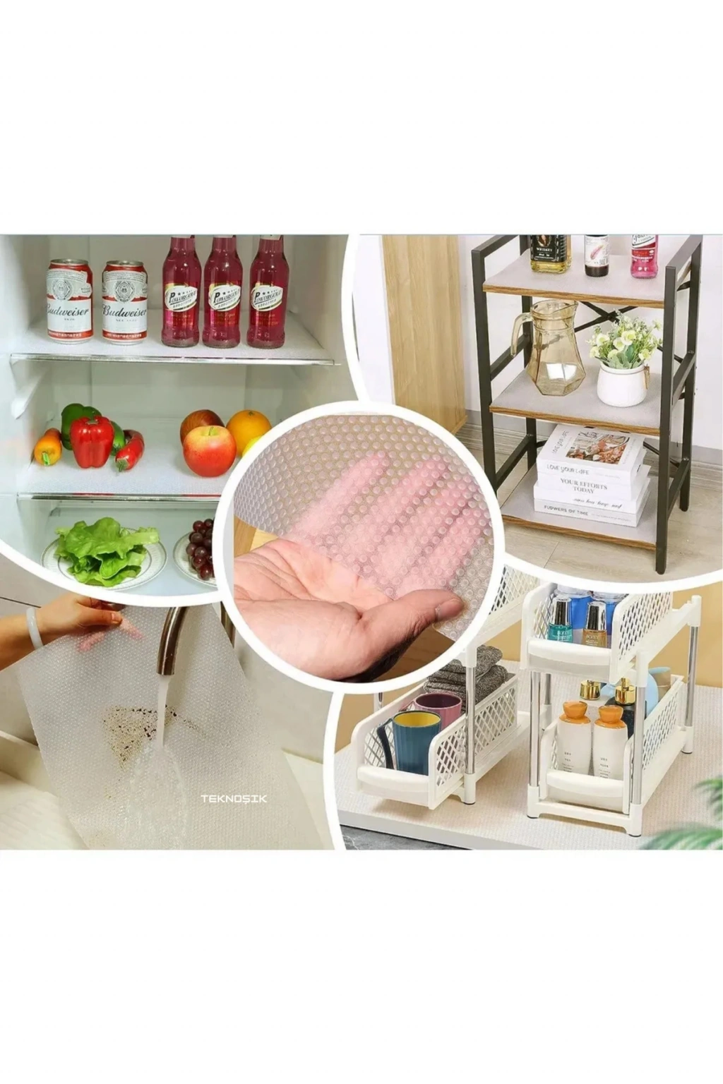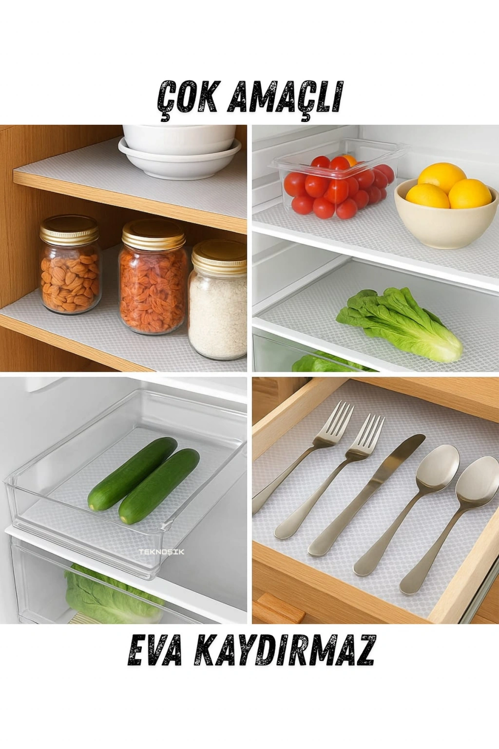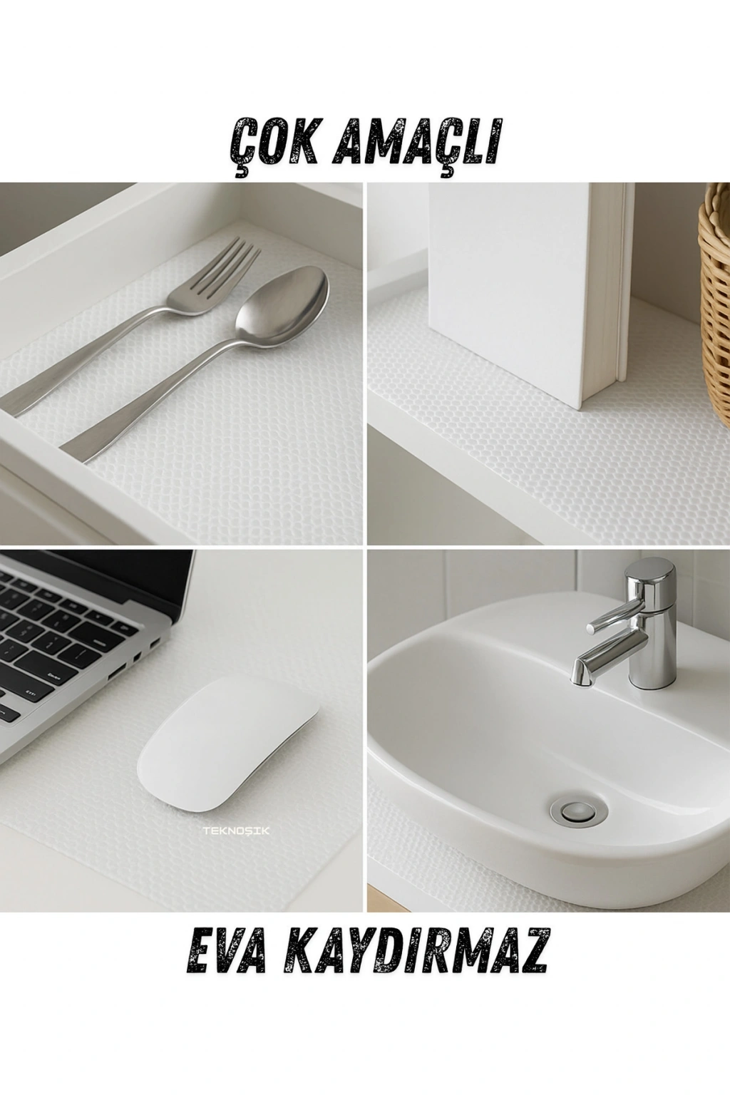 Kaydırmaz Şeffaf Raf ve Çekmece Örtüsü 45x300 cm – Kalın PVC Koruyucu Eva Mat Ev düzenini korumanın en pratik yolu! Bu kaydırmaz şeffaf raf örtüsü, mutfak dolapları, çekmeceler, banyo rafları ve buzdolabı içleri için mükemmel bir koruma sağlar.; Kalın PVC + EVA malzemeden üretilmiştir; dayanıklı yapısı sayesinde uzun süre deforme olmadan kullanılabilir.; --- ? Öne Çıkan Özellikler ✅ Kaydırmaz yüzey: Eşyaların sabit kalmasını sağlar, gürültü ve çizilme sorununu ortadan kaldırır.; ✅ Şeffaf ve estetik görünüm: Her ortama uyum sağlar, mobilya rengini kapatmaz.; ✅ Suya ve yağa dayanıklı yapı: Kolay temizlenir, hijyeniktir.; ✅ Kesilebilir tasarım: 45x300 cm uzunluğu sayesinde istenen ölçüye göre kolayca kesilebilir.; ✅ Çok amaçlı kullanım: Mutfak, banyo, dolap, raf, buzdolabı ve tezgahlar için idealdir.; --- ? Kullanım Alanları Mutfak dolabı içi Çekmece altlığı Raf düzenleyici Buzdolabı tabanı Banyo dolabı --- ? Neden Tercih Etmelisiniz? Bu şeffaf kaydırmaz örtü; eşyalarınızı korur, temizlik kolaylığı sağlar ve mobilyalarınızın ömrünü uzatır.; Hem estetik hem de pratik bir ev yardımcısı!