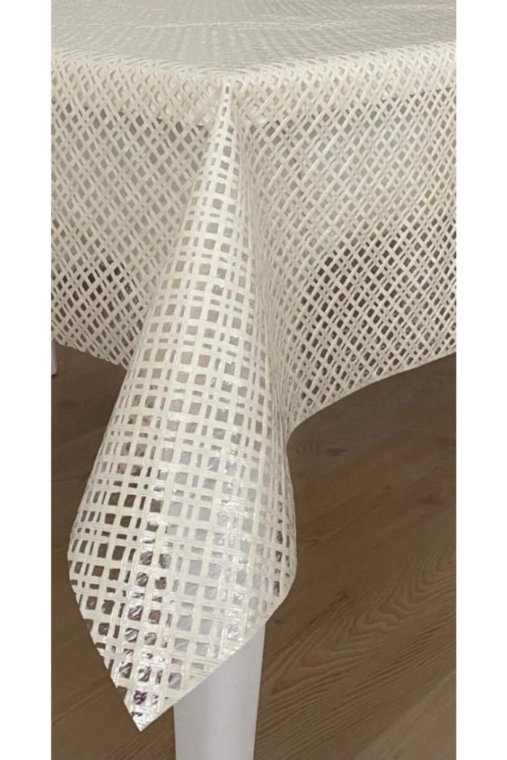 Şeffaf Kaplamalı Çapraz Örgü Hasır Desenli Pvc Muşamba Masa Örtüsü Krem