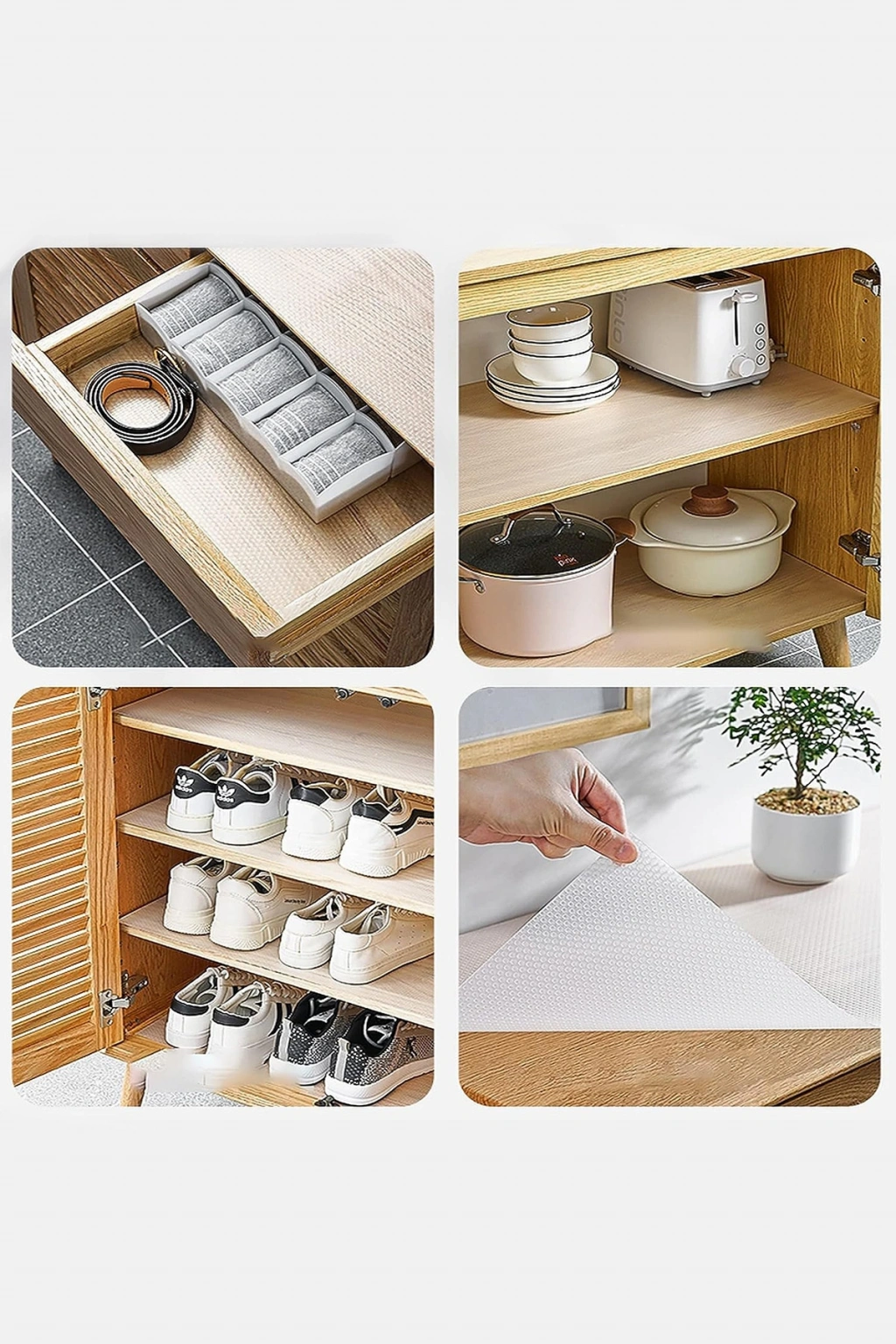 - Şeffaf tasarımı sayesinde dolabınızın içindekileri kolayca görebilir ve düzenli bir görünüm sağlar.; - Kaymaz yapısı ile dolap kapaklarının yerinde kalmasını ve güvenli bir kullanım sunar.; - Tek parça halinde gelen bu ürün, pratik bir montaj imkanı sunar ve ekstra parçalara ihtiyaç duymazsınız.; - Beyaz web rengiyle modern ve şık bir görünüm kazandırırken, şeffaf yapısı ile dolabınızın iç mekanını da aydınlatır.; - Type 0 yıkama talimatına uygun olarak temizlenebilir; böylece uzun ömürlü kullanım için kolay bakım imkanı tanır.; - Türkiye menşeli olmasıyla yerel üretimden yana tercih yapmanızı sağlar ve kalite