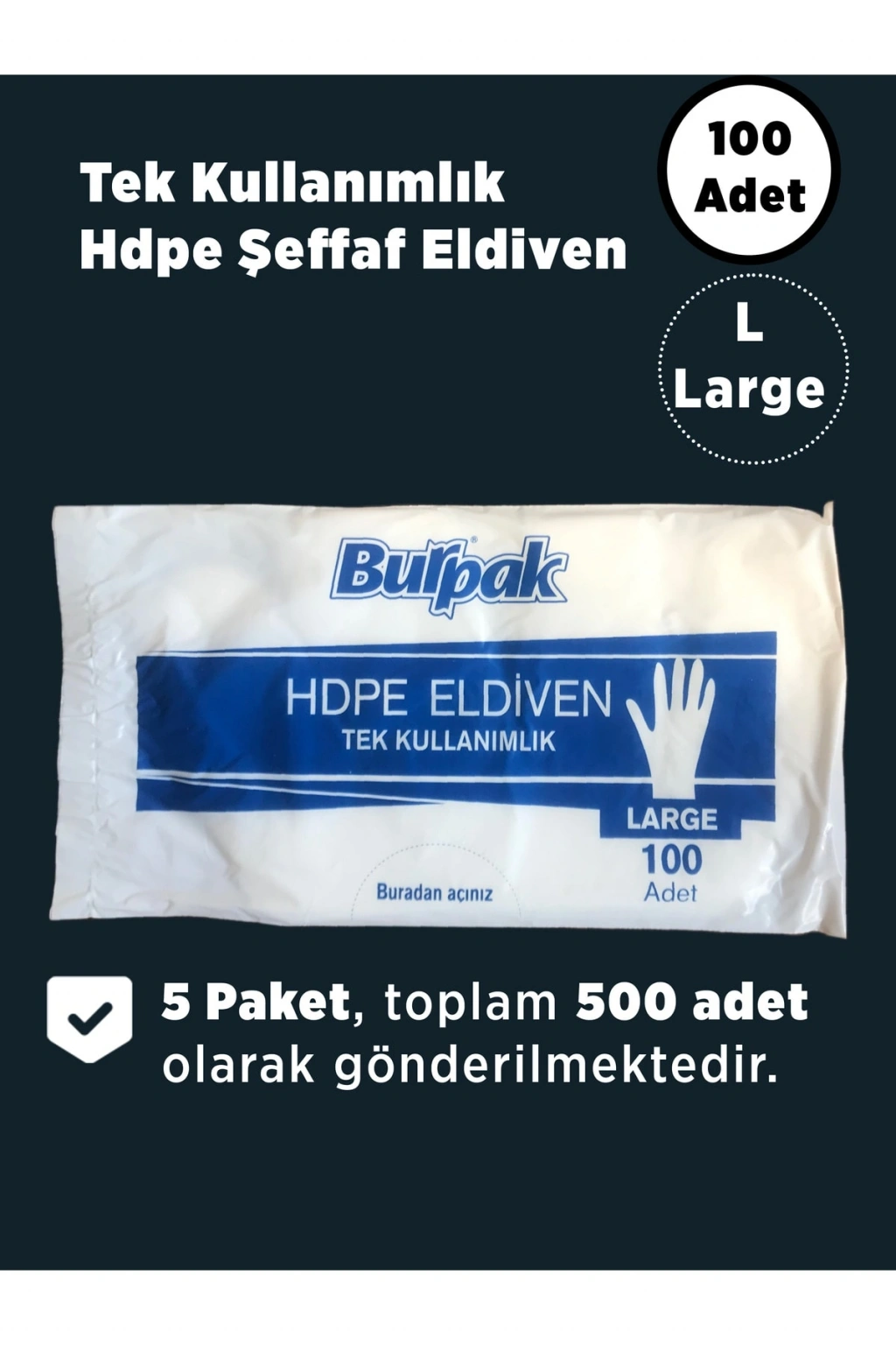 Burpak 100'lü HDPE şeffaf eldiven.5 Paket, toplam 500 adet olarak gönderilmektedir. ; ; Kokusuzdur. ; ; Pratik kullanımı sayesinde gıdaların el değmeden hazırlanmasına olanak sağlar. ; ; Gıda, sağlık,temizlik ve hijyen gerektiren alanlarda kullanılabilir. ; ; Tek bedendir. Her boy el için uygundur. ; ; Steril değildir. ; ; İki ele uyumludur, elin şeklini alarak kolay hareket imkanı sağlar. ; ; Tek kullanımlıktır. ; ; Gönderilen ürünler, görsellerde bulunan fotoğraflar ile aynıdır. ; ; Her pakette 100 adet bulunmaktadır. ;