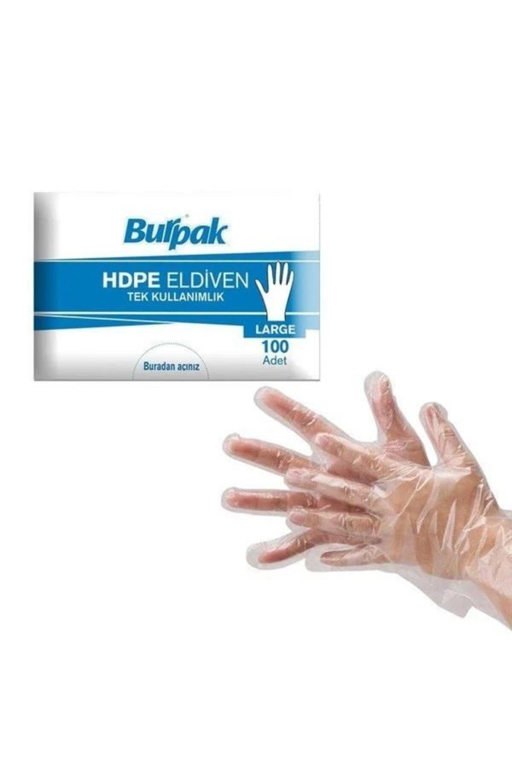 BURPAK TEK KULLANIMLIK ŞEFFAF ELDİVEN 100 LÜ TAKRİBİ 60 G.; Hijyen, pratiklik ve ekonomik kullanım bir arada! Burpak marka tek kullanımlık eldivenler; gıda hazırlama, temizlik, bakım ve günlük hijyenik işler için ideal bir çözümdür.; Şeffaf yapısı sayesinde rahat kullanım sunar.; ✅ Ürün Özellikleri: Marka: Burpak Adet: 100 adet Ağırlık: Takribi 60 gram Renk: Şeffaf Malzeme: Polietilen (PE) Beden: Standart (unisex) Ambalaj: Poşetli ambalaj ? Kullanım Alanları: Gıda ve mutfak hijyeni Market, kasap ve fırın kullanımı Temizlik işleri Kuaför & boya uygulamaları Günlük kullanım (toplu taşımada, halka açık alanlarda vs.; ) ? Avantajları: Kolay giyilir ve çıkarılır Lateks içermez – alerik bireyler için uygundur Tek kullanımlıktır – hijyen sağlar Ekonomiktir – yüksek adetli ambalaj Evde, iş yerinde, mutfakta veya dışarıda hızlı ve pratik hijyen için güvenle kullanabilirsiniz.